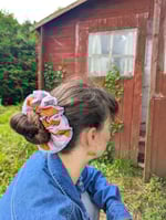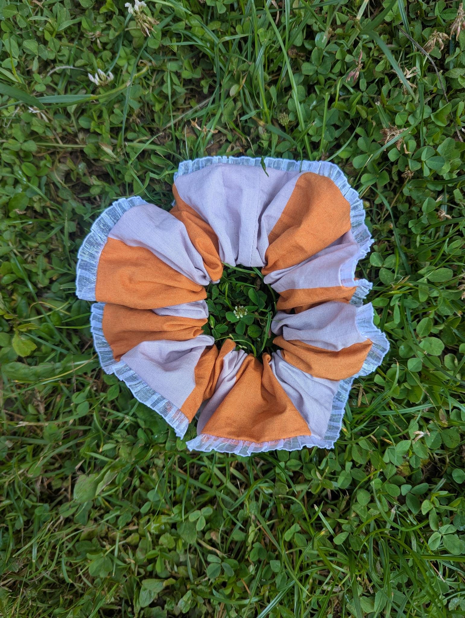 Ce chouchou berlingot abricot-lavande est composé d'un tissu coloré vintage et d'un volant transparent blanc.